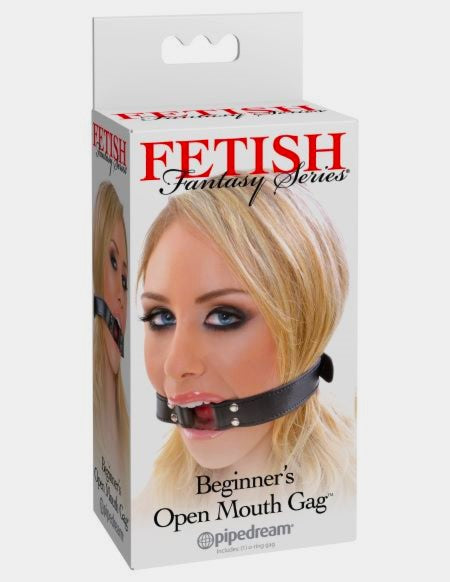 Fetish Fantasy Series. Beginners Open Mouth Gag Black from Pipedream Products. Open wide and say ahhh! with the Beginner's Open Mouth Gag! This sexy O-ring gag is made for first timers and features a 1.75 inches inside diameter. With the sturdy ring gag held securely between their jaw, your subject will not be able to say a word, while their mouth is propped wide open and easily accessible! The metal ring gag is wrapped in vinyl and secured in place with an adjustable vinyl head strap and metal buckle. Pull the straps tight and your subjects mouth will magically stay open for you to do as you please! What happens next is up to you! One size fits most. Adjustable Vinyl head strap with vinyl covered o-ring. Keeps mouth open wide. Perfect for beginners. Specifications: package depth 2.25 inches, package width 3.25 inches. Package height 6.75 inches.