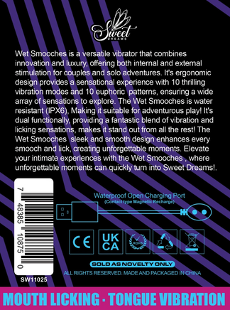 Wet Smooches is a versatile vibrator that combines innovation and luxury, offering both internal and external stimulation for couples and solo adventures. It's ergonomic design provides a sensational experience with 10 thrilling vibration modes and 10 euphoric patterns, ensuring a wide array of sensations to explore. The Wet Smooches is water resistant (IPX6), Making it suitable for adventurous play! It's dual functionally, providing a fantastic blend of vibration and licking sensations, makes it stand out from all the rest! The Wet Smooches sleek and smooth design enhances every smooch and lick, creating unforgettable moments. Elevate your intimate experiences with the Wet Smooches , where unforgettable moments can quickly turn into Sweet Dreams!